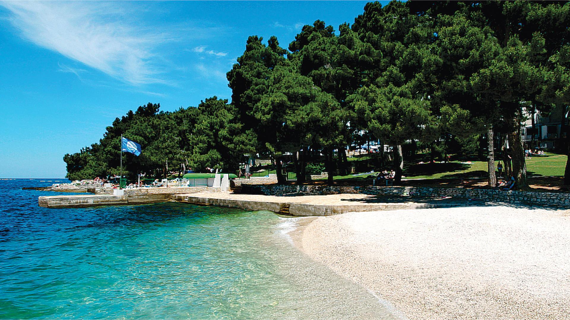 Hotel Parentium beach is a rocky resort beach, situated along a small peninsula and characterized by elevated reefs with smaller gravel sections. The beach has beach guards, lifesaving equipment, first aid, infirmary, facilities for receiving recyclable waste, catering establishment. The beach guards are present from 8 a.m. to 5 p.m. (May 15-September 30). There are no environmentally sensitive areas in close proximity of the beach and the beach can be approached by paved walkways. The beach has a bulletin board (info on conditions on the beach, results of sampling, map of sampling points, cultural and protected heritage, etc), camp reception disseminating all relevant information, eco-activities, signs, gazettes, regulations.