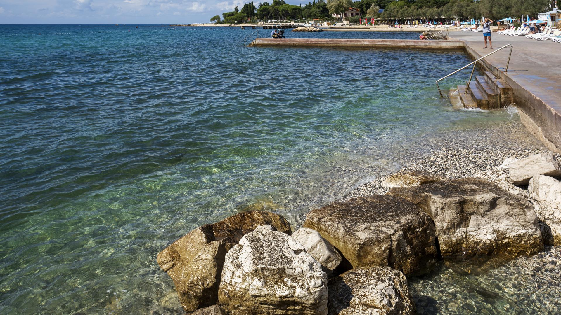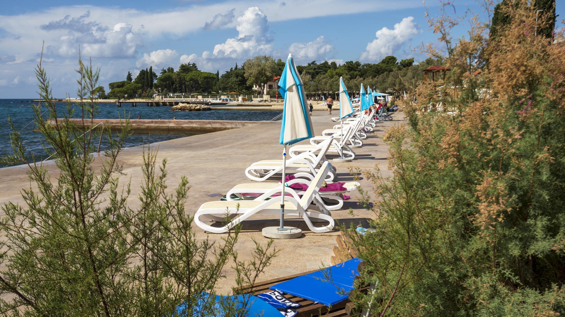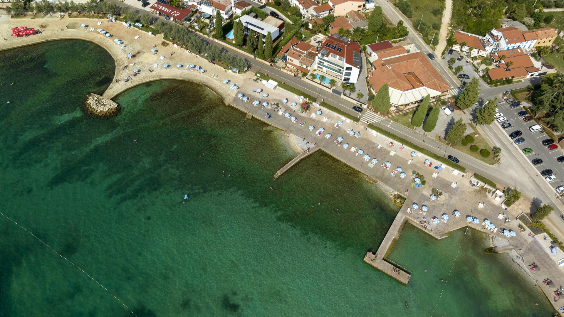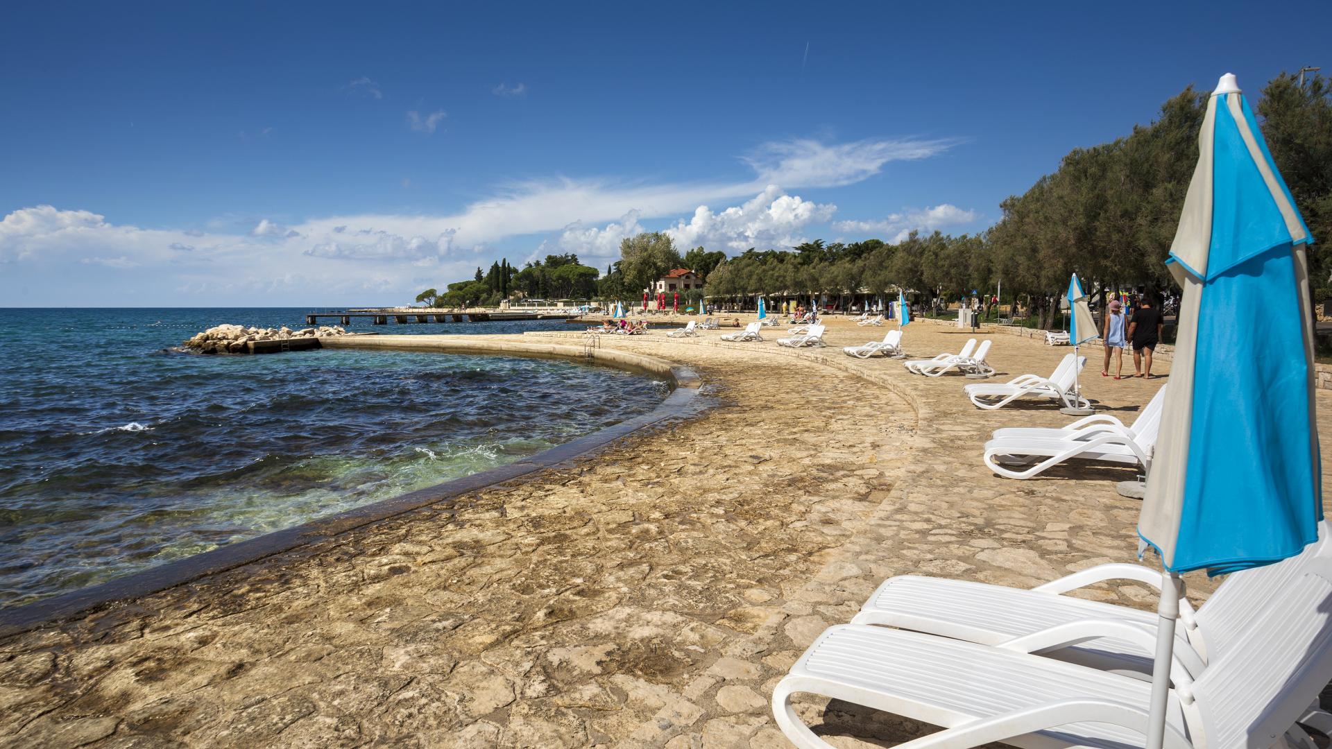 The refreshed beach, located in the northern part of Poreč, can be accessed on foot, by bike or by car. The beach is equipped with the sea access facilities and a sunbathing area by the sea made by pebble depositing and levelling.