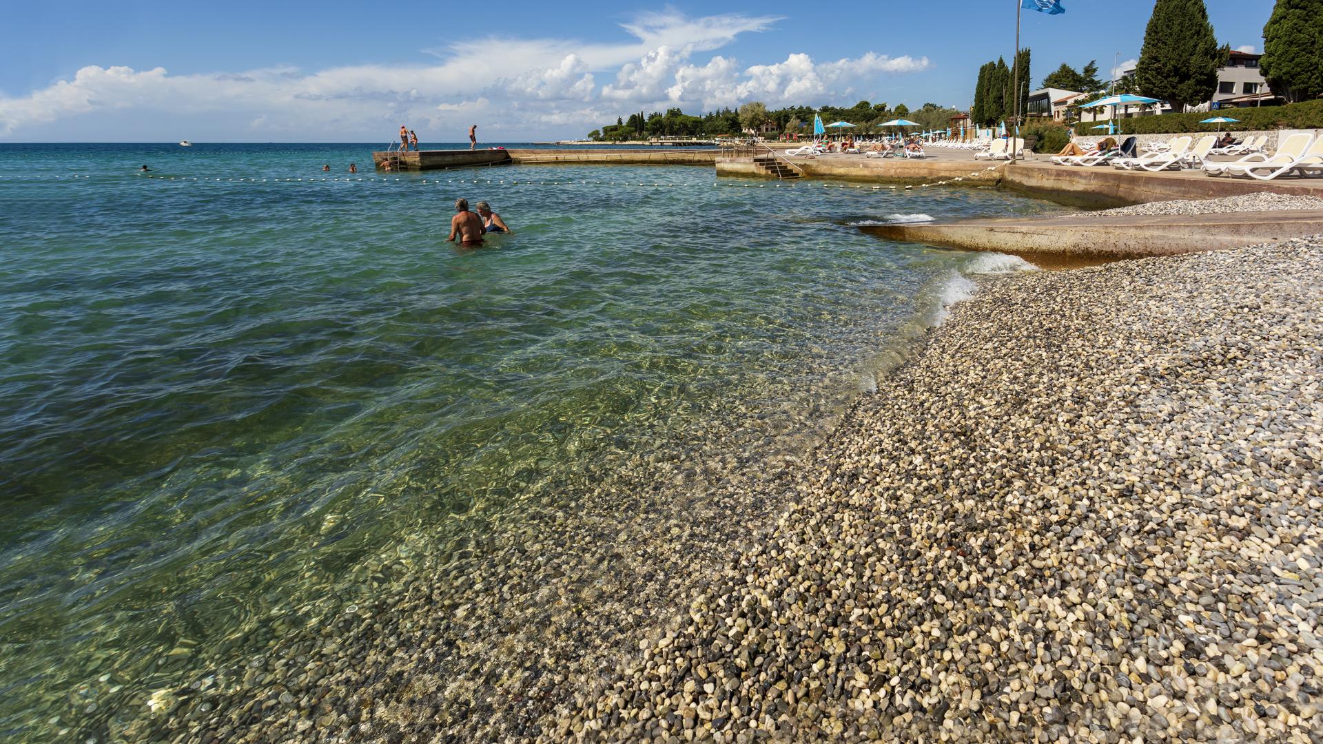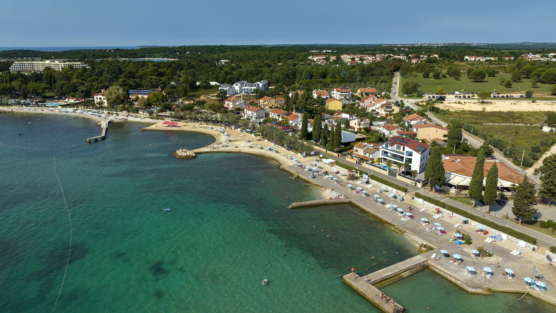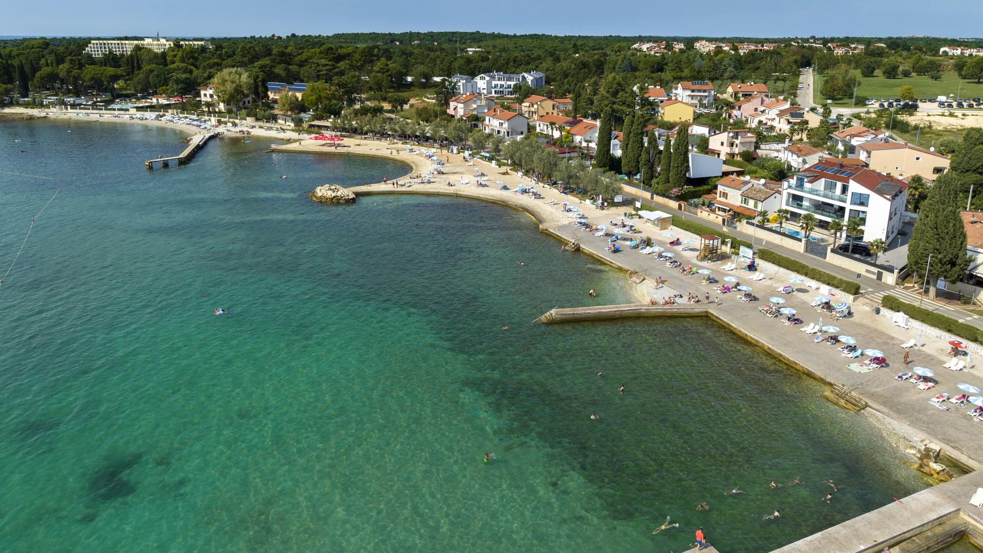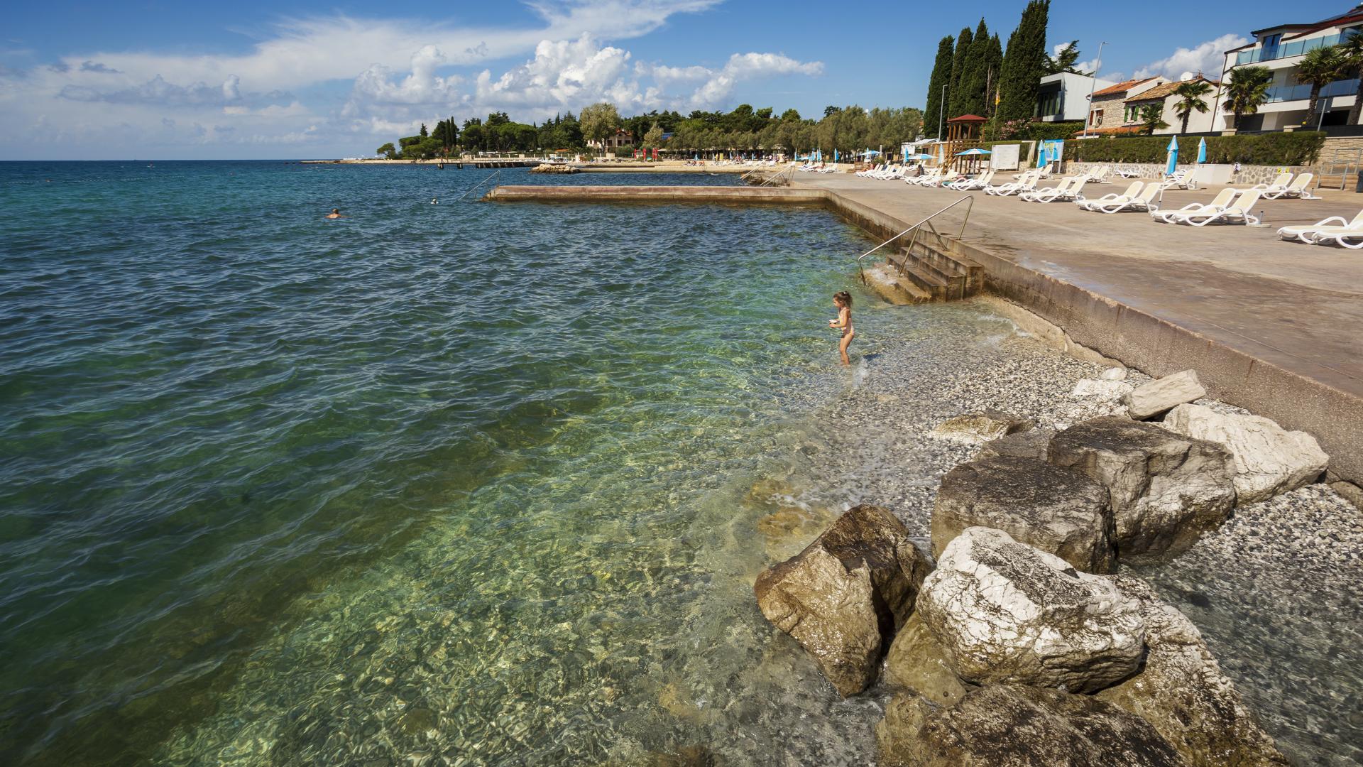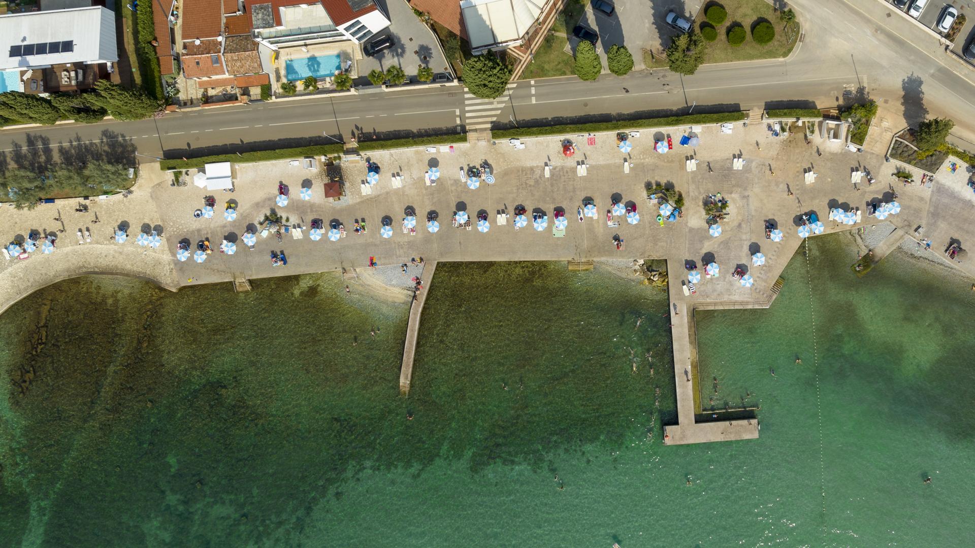 The refreshed beach, located in the northern part of Poreč, can be accessed on foot, by bike or by car. The beach is equipped with the sea access facilities and a sunbathing area by the sea made by pebble depositing and levelling.