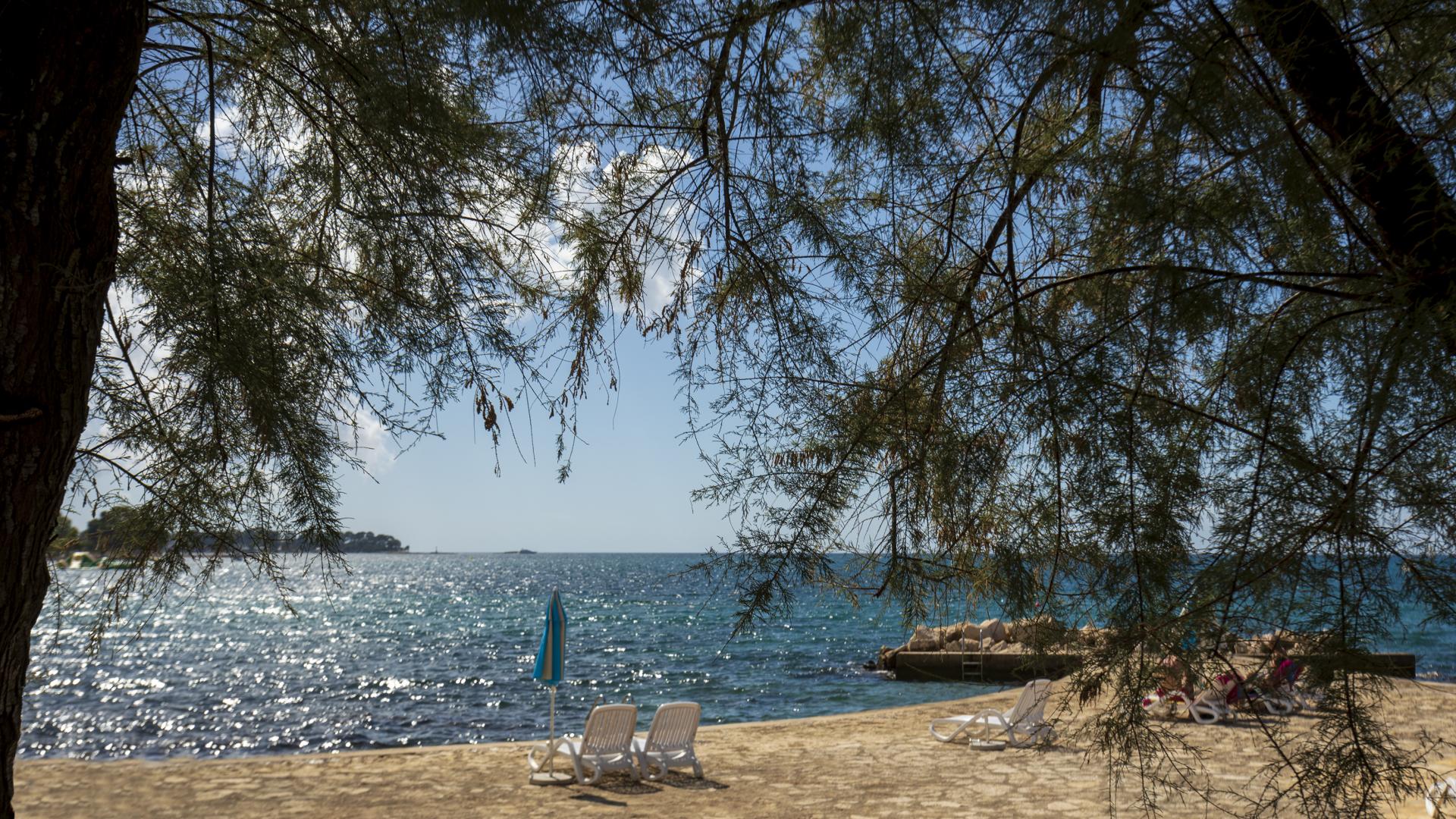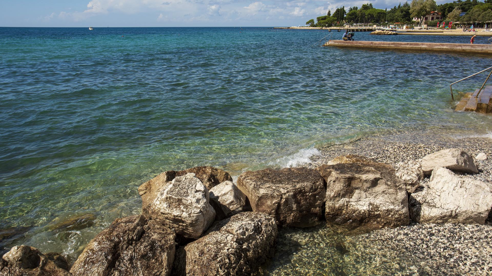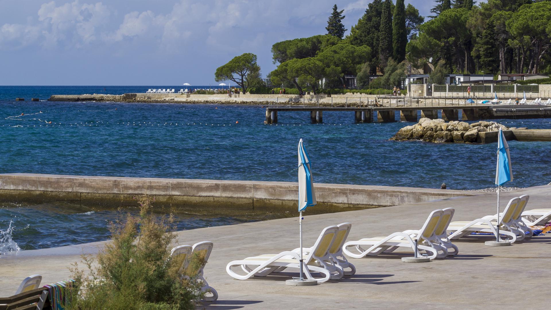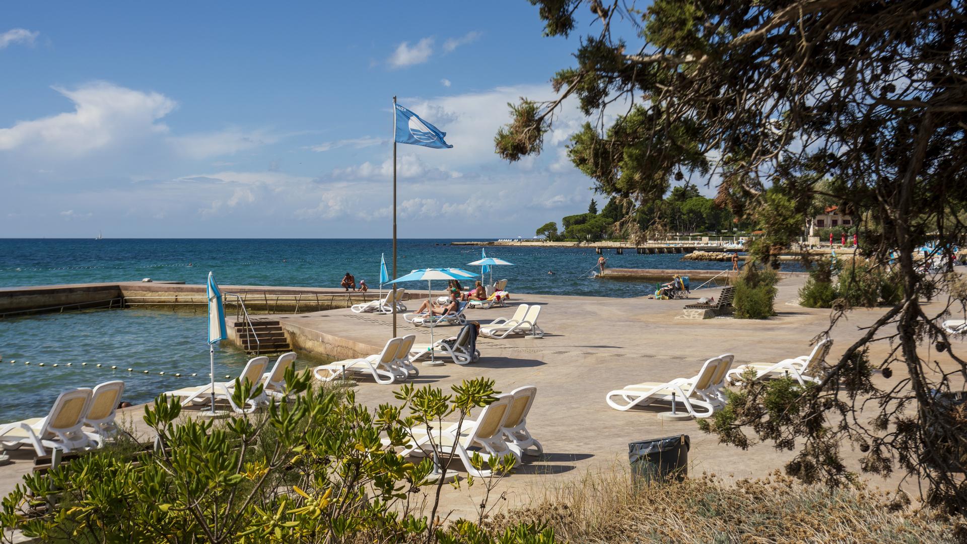 The refreshed beach, located in the northern part of Poreč, can be accessed on foot, by bike or by car. The beach is equipped with the sea access facilities and a sunbathing area by the sea made by pebble depositing and levelling.