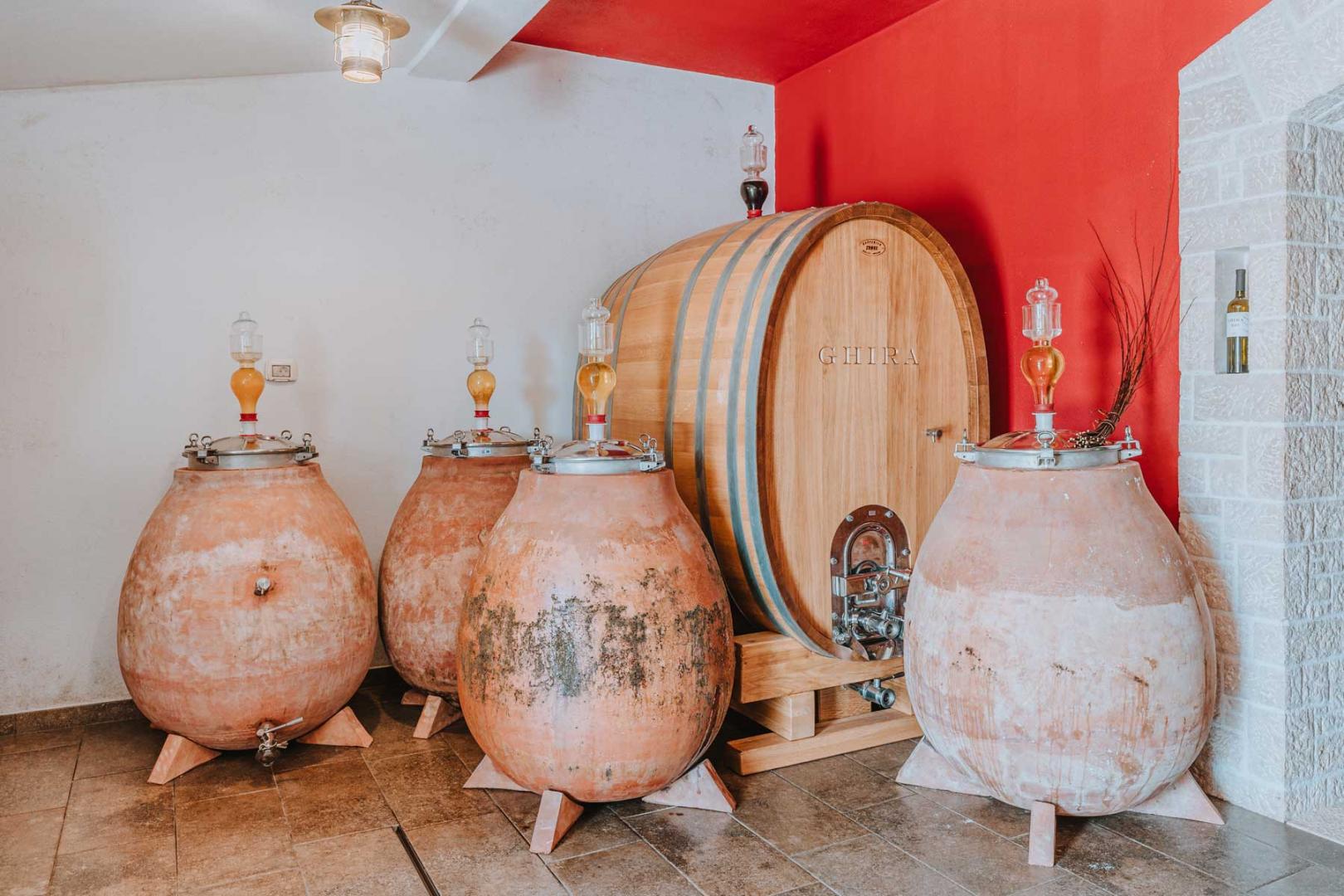 The winery currently has 6 amphoras. In these containers is Malvasia from 2021 (already the fifth vintage in a row) "which was made exclusively in the vineyard, treated with minimal doses of copper and sulfur, nettle, propolis, algae, etc... a lot of manual work, the soil is cultivated only on the surface in the dry period, sulfites are added to the wine in minimal doses and are gradually reduced, the fermentation is not controlled, the wines are not filtered and not stabilized. Today, OPG wines under the GHIRA brand with an ecological certificate are sold mainly in northwestern Istria, but they can also be found in restaurants in Italy, Slovenia, Austria, Germany and France.